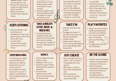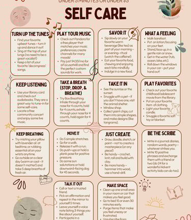 Use this one-sheet for a quick guide to self-care activities that take less than 5 minutes or cost less than $5